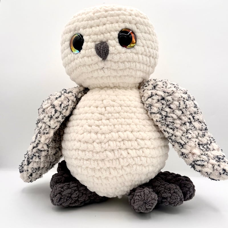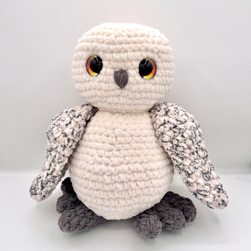 Cute soft snowy owl made out of the Bernant Blanket yarn. Roughly about 13-14 inches tall. Eye color may vary. If you want a specific Eye color please note in the order or send me an email. Pattern by CrochetGrove
